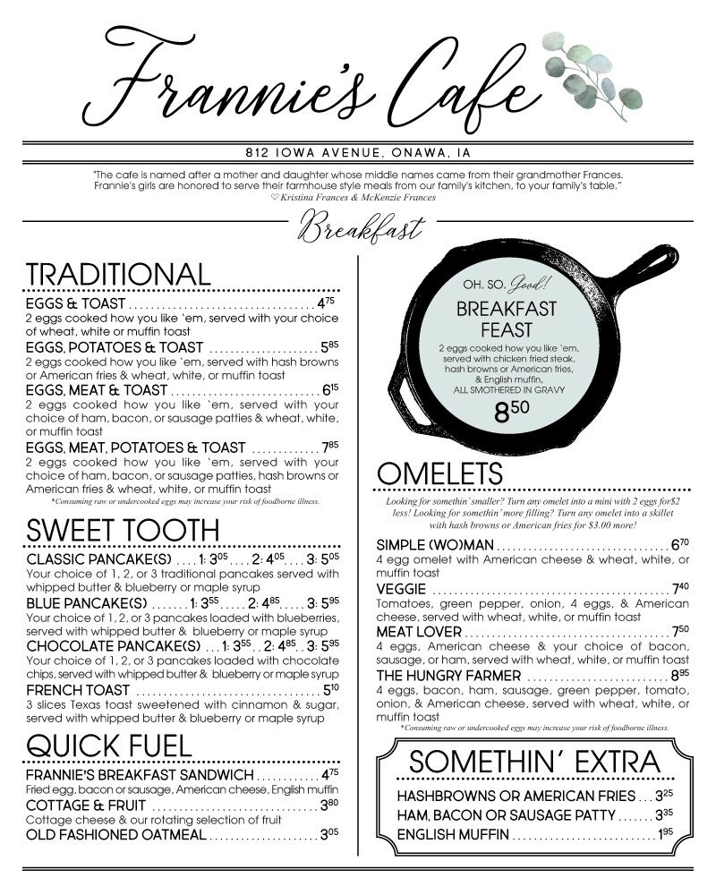 Welcome to Frannie’s Cafe, a hidden gem nestled in the heart of Onawa, Iowa. This vibrant sports bar offers a menu that effortlessly blends classic comfort food with bold flavors. As you step inside, the inviting atmosphere sets the stage for a memorable dining experience.